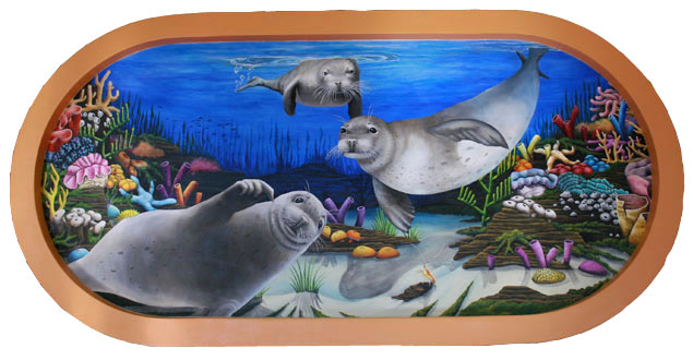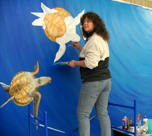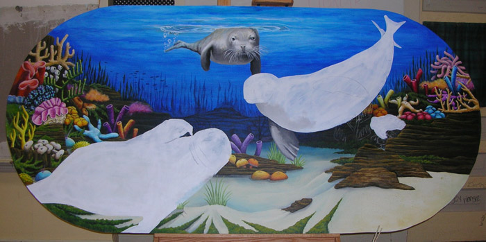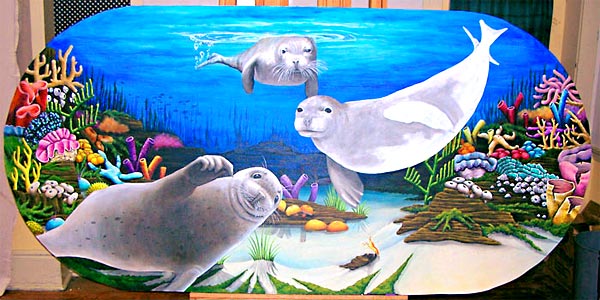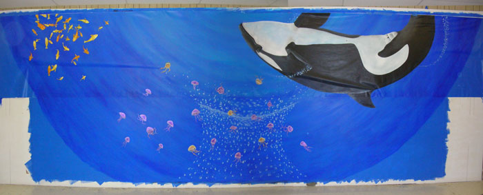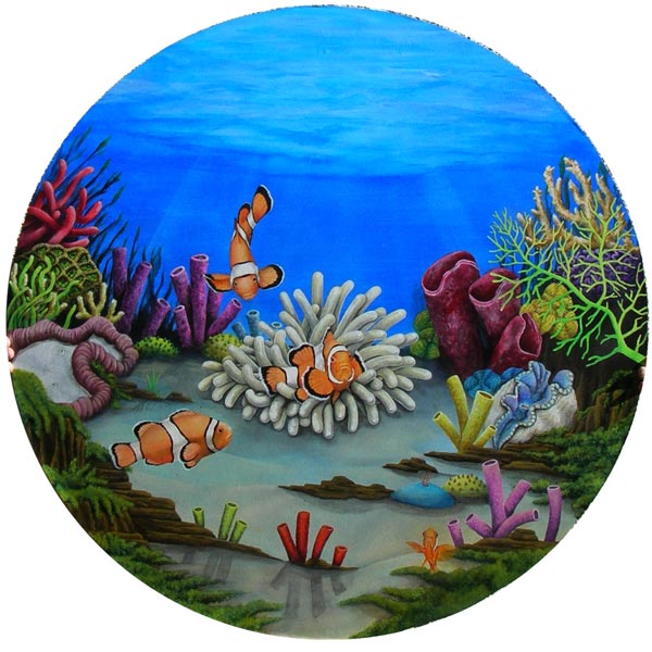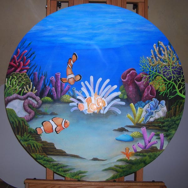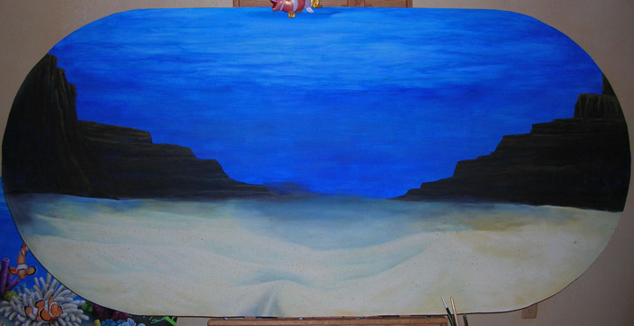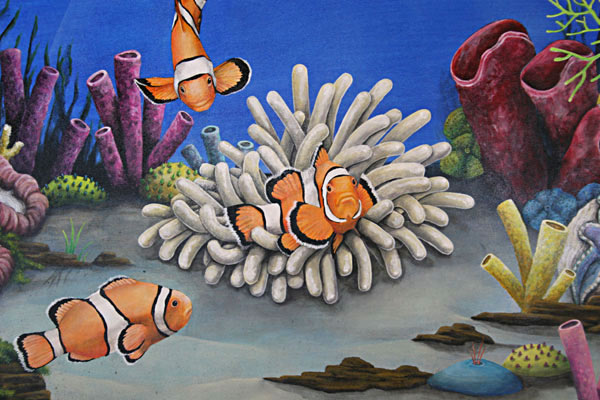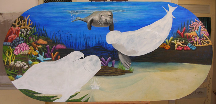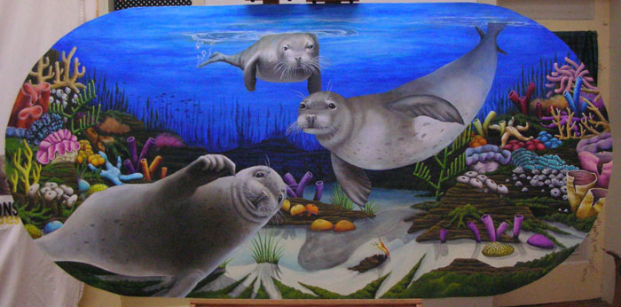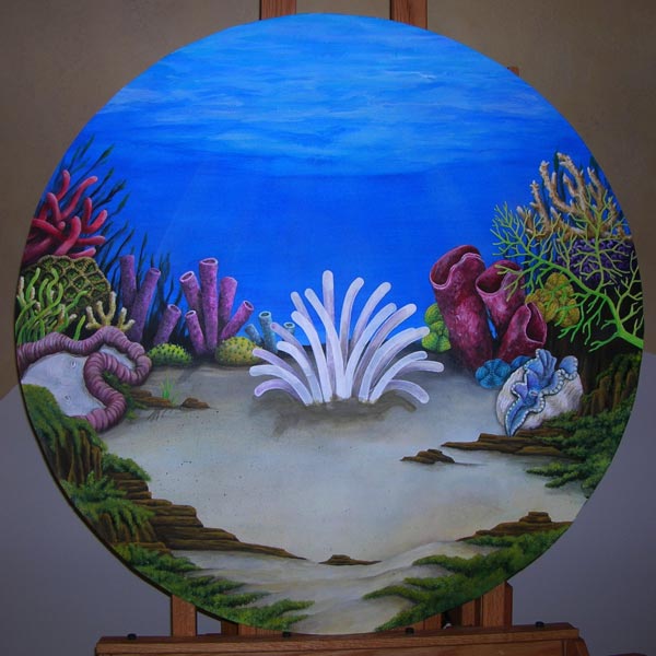 I find that my style of painting works very well with underwater scenes, as I combine vibrant colors with a fine level of detail. I had a lot of fun painting these murals which were installed in a new dentist’s office which catered to children. The office itself was full of bright colors, so my murals needed to stand out!