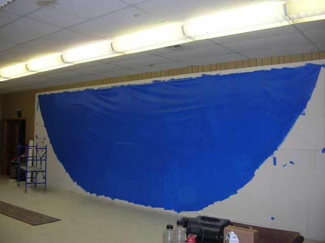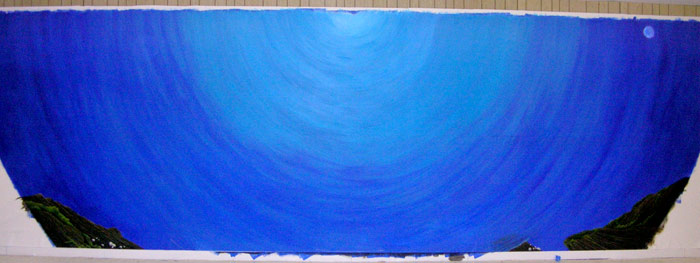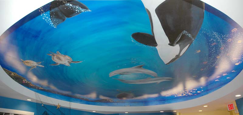 And the 3rd mural for this project was the biggest. It was approximately 25′ (7.6m) diameter and was installed on the ceiling over the work area. This gave the kids something to look at (and be distracted by) while the dentist fixed their teeth. I was scheduled to deliver the mural for installation and then touch it up after their team installed it – BUT – their team didn’t show up, so 3 of us installed it one night. Not something I want to do again. 😉