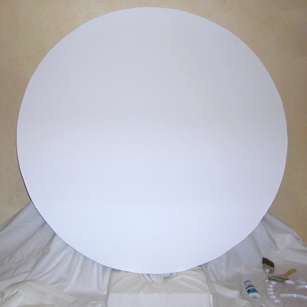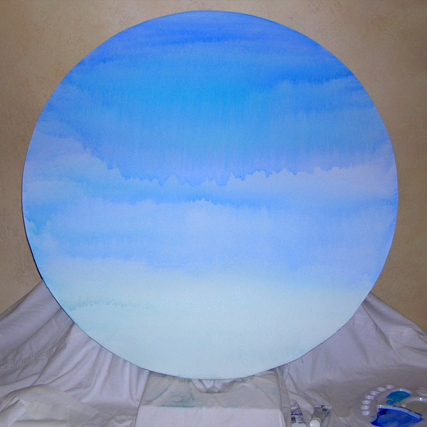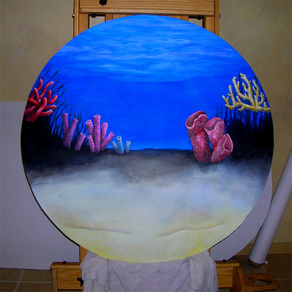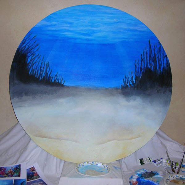 This next series shows the progress on a smaller 4′ (1.2m) diameter mural. I made the frames from foam and hard coated them, then finished the frames on site after I installed the mural.