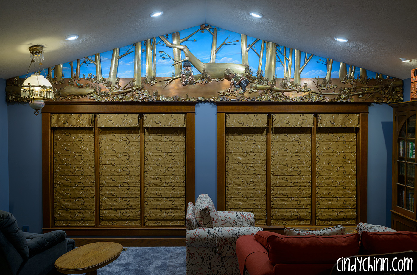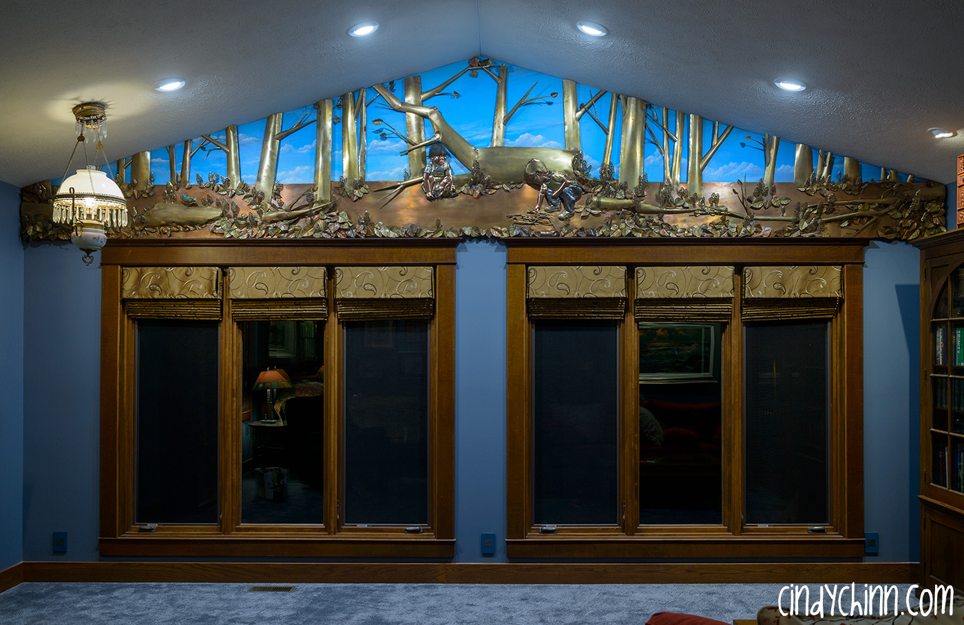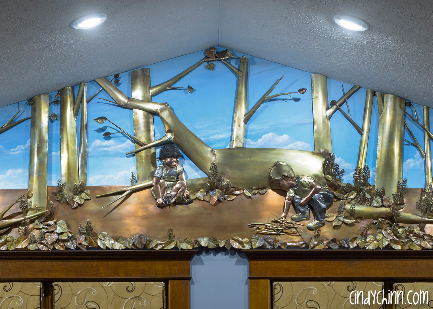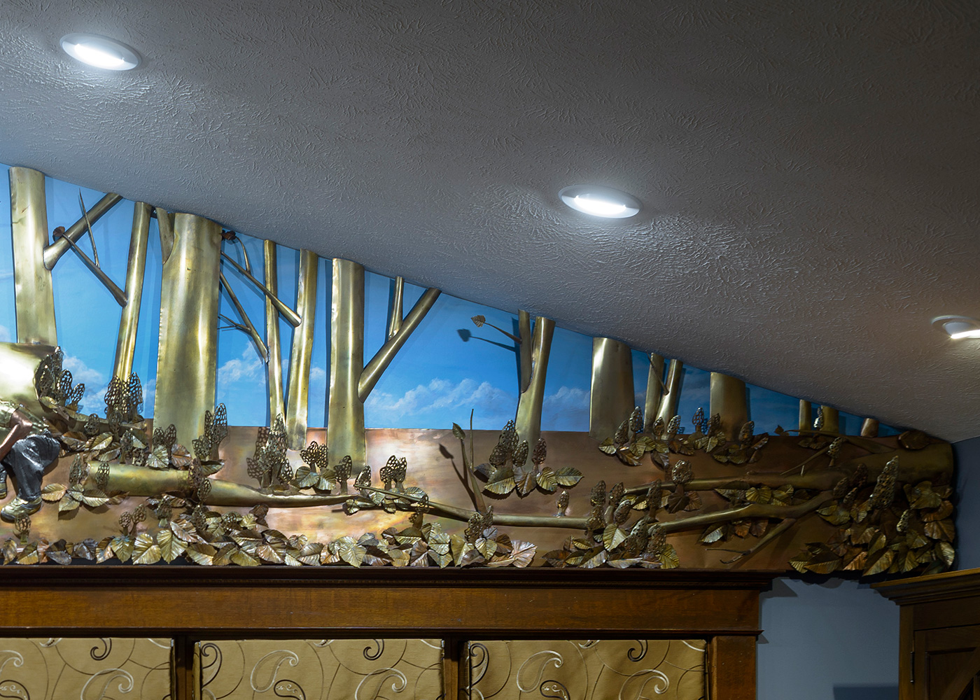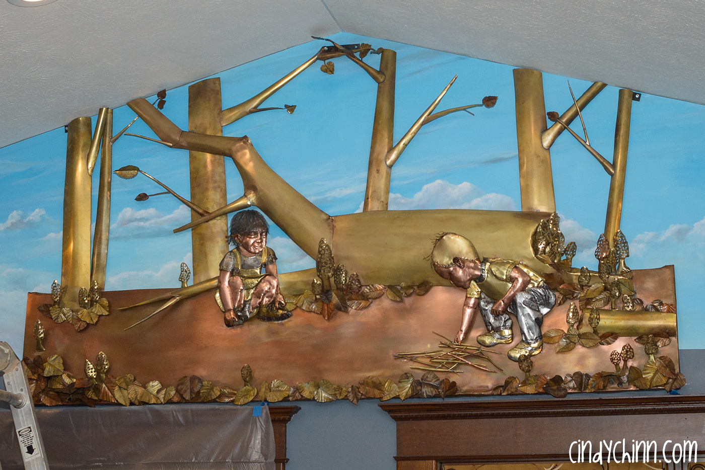 The copper and brass piece is installed and the client loves it! Another successful art project. I learned a lot on this one and had a lot fun with it. There was a fine mix of engineering new techniques and creative insights to complete this one. 20′ across and 4′ tall – 500 leaves – 150 mushrooms – 2 kids – 1 bird.