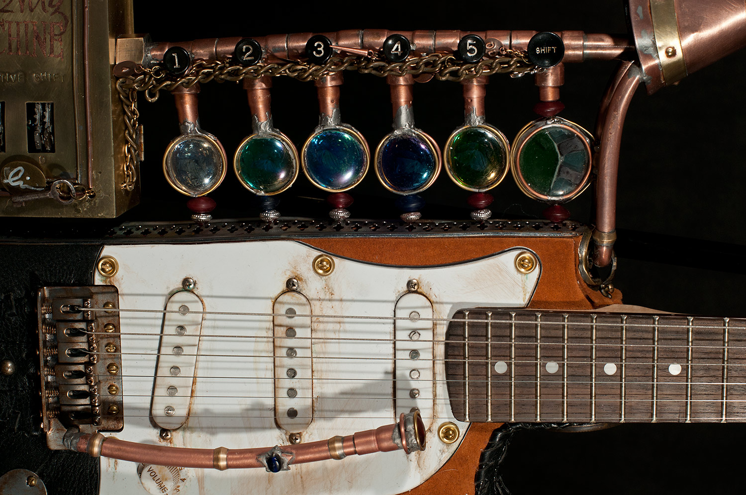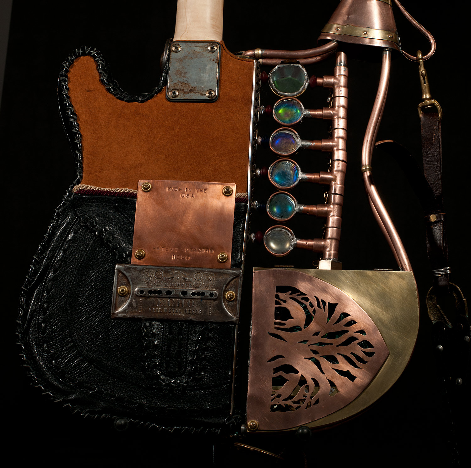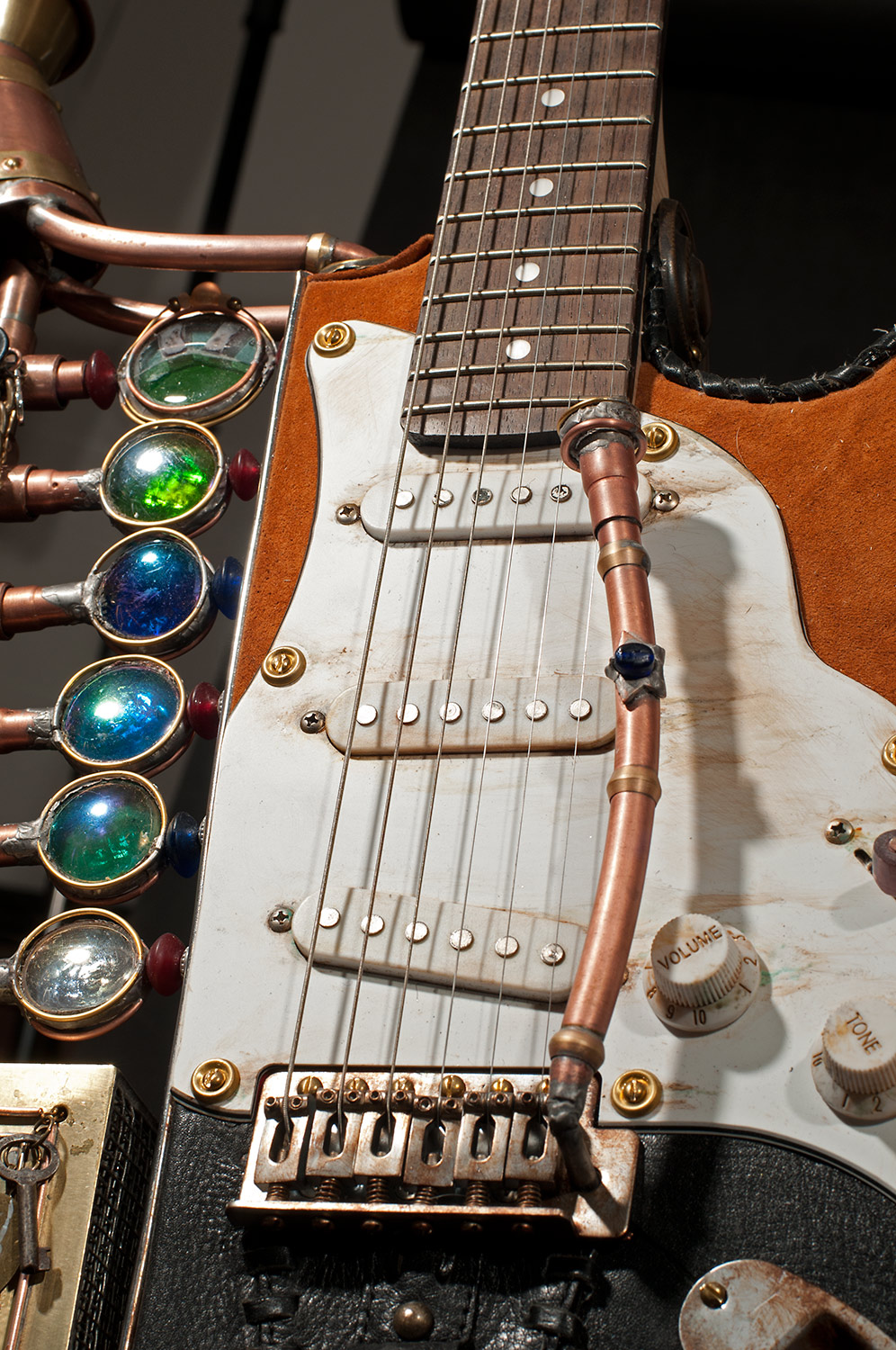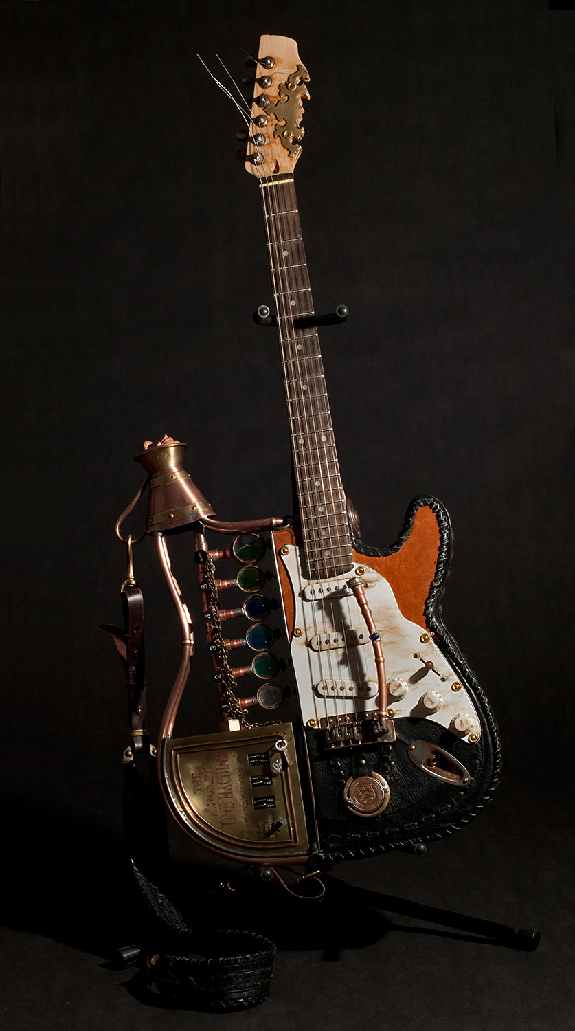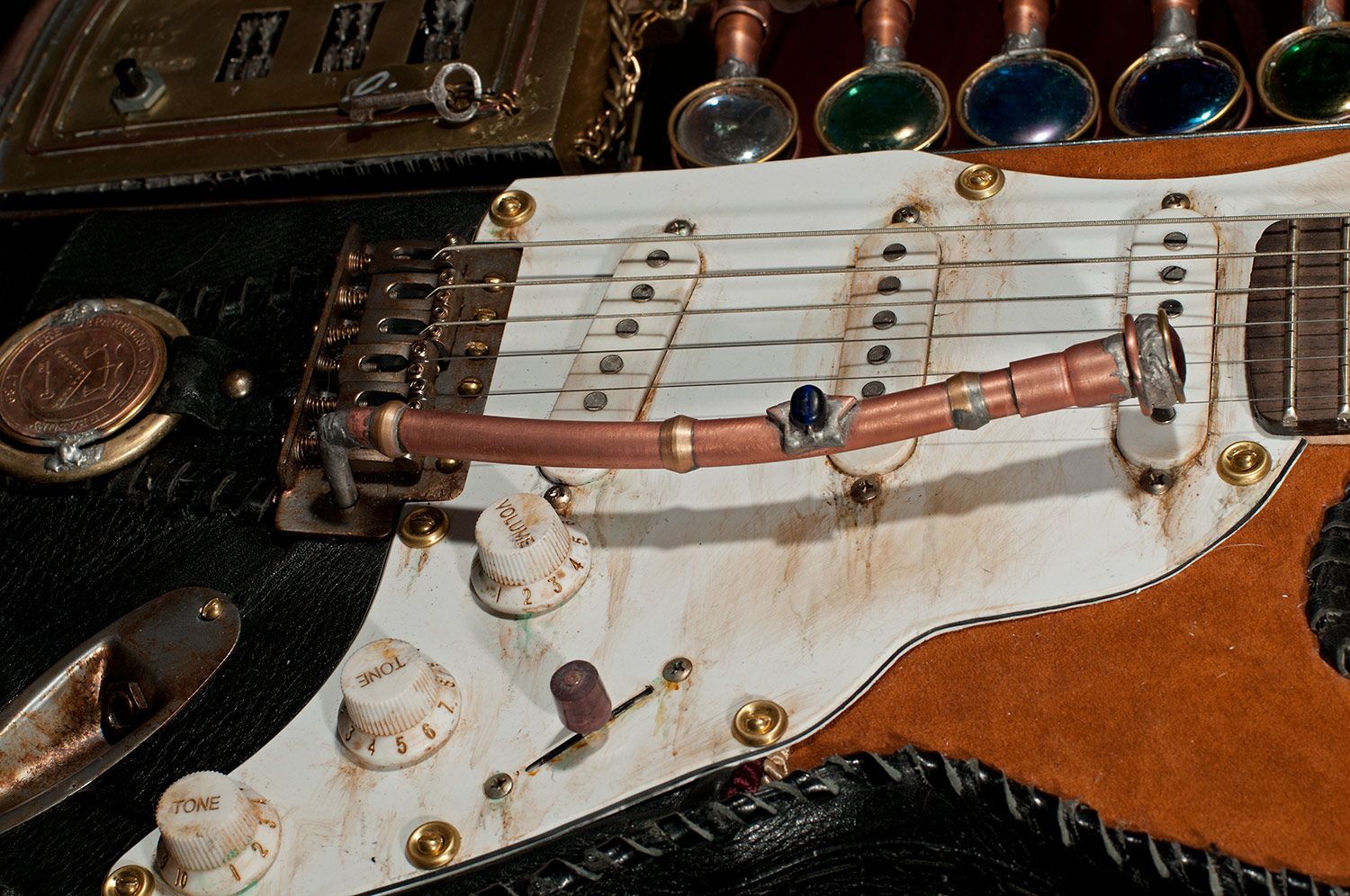 From there I started looking around to see what I had to work with and add to the guitar. I used an old pair of suede shorts to cover part of the body. I used an old leather purse to cover the rest. I built a copper and glass structure to use for the time machine meter that was added to the part of the body that was cut way. I built a custom whammy bar from copper pipe. I added a medallion, a sculpted face and other parts that friends donated. There’s just too much to mention, but I had a blast finding parts to re-purpose.