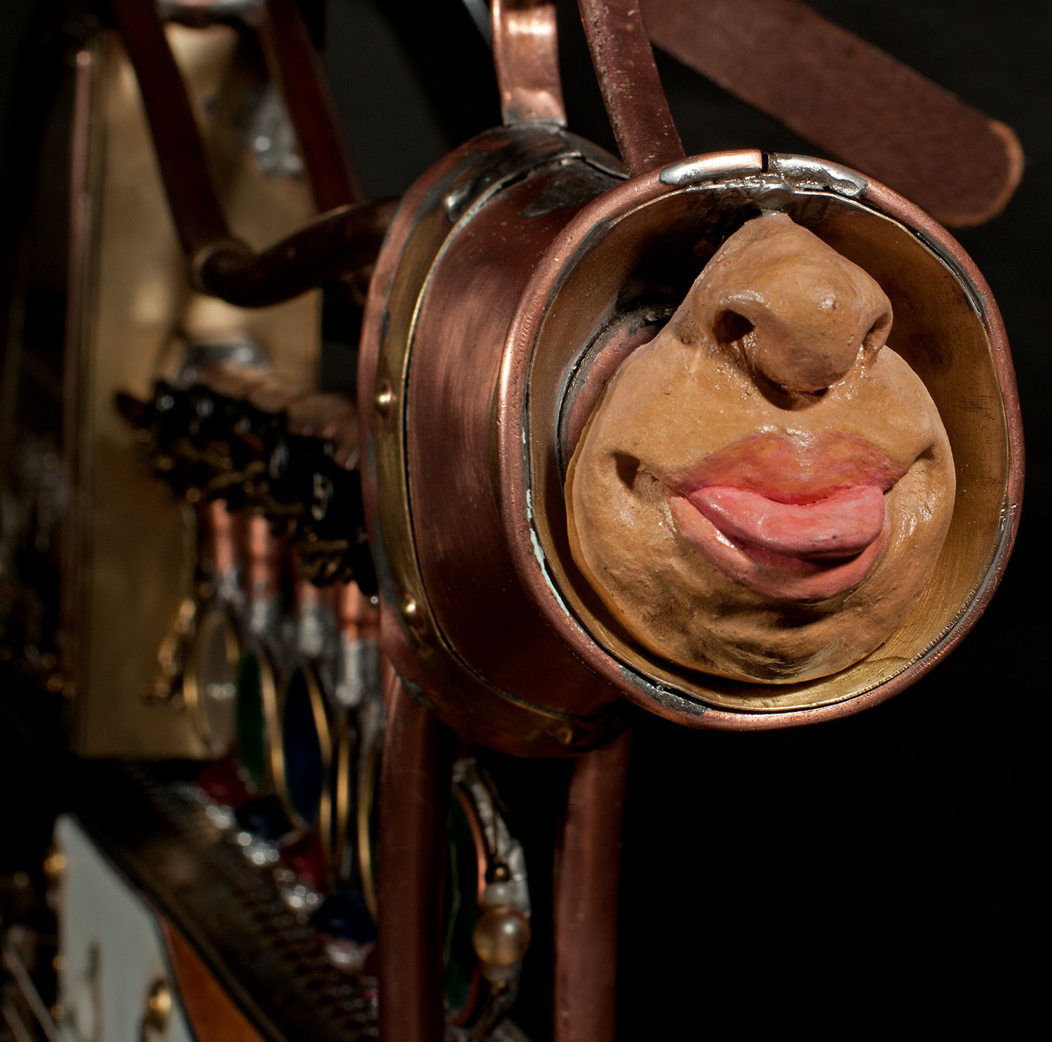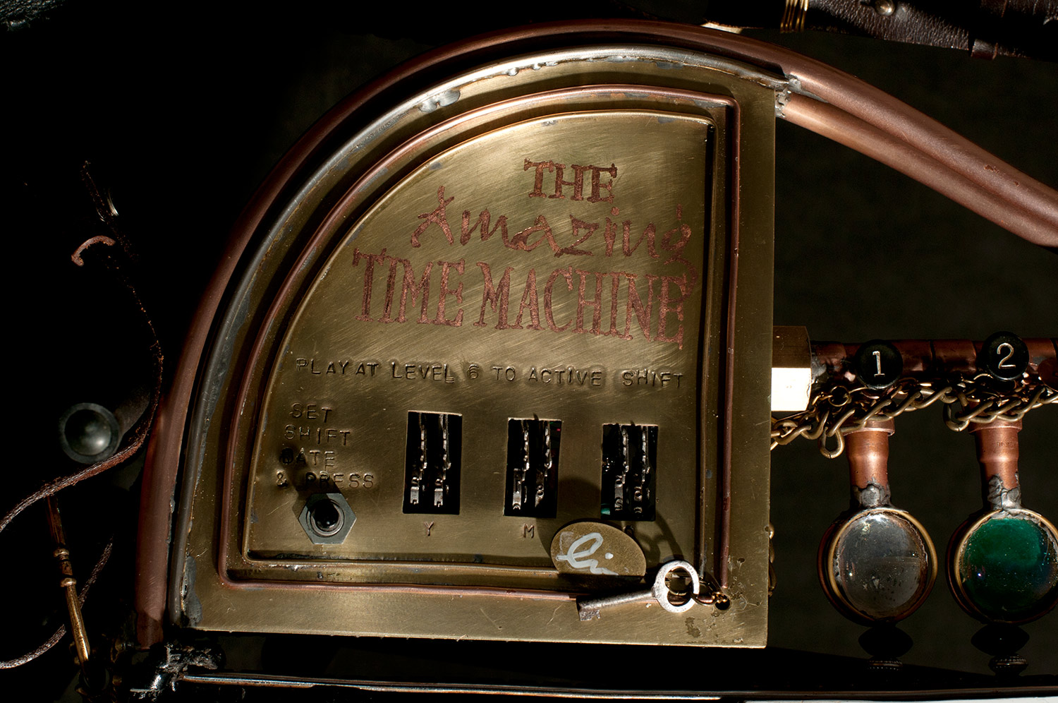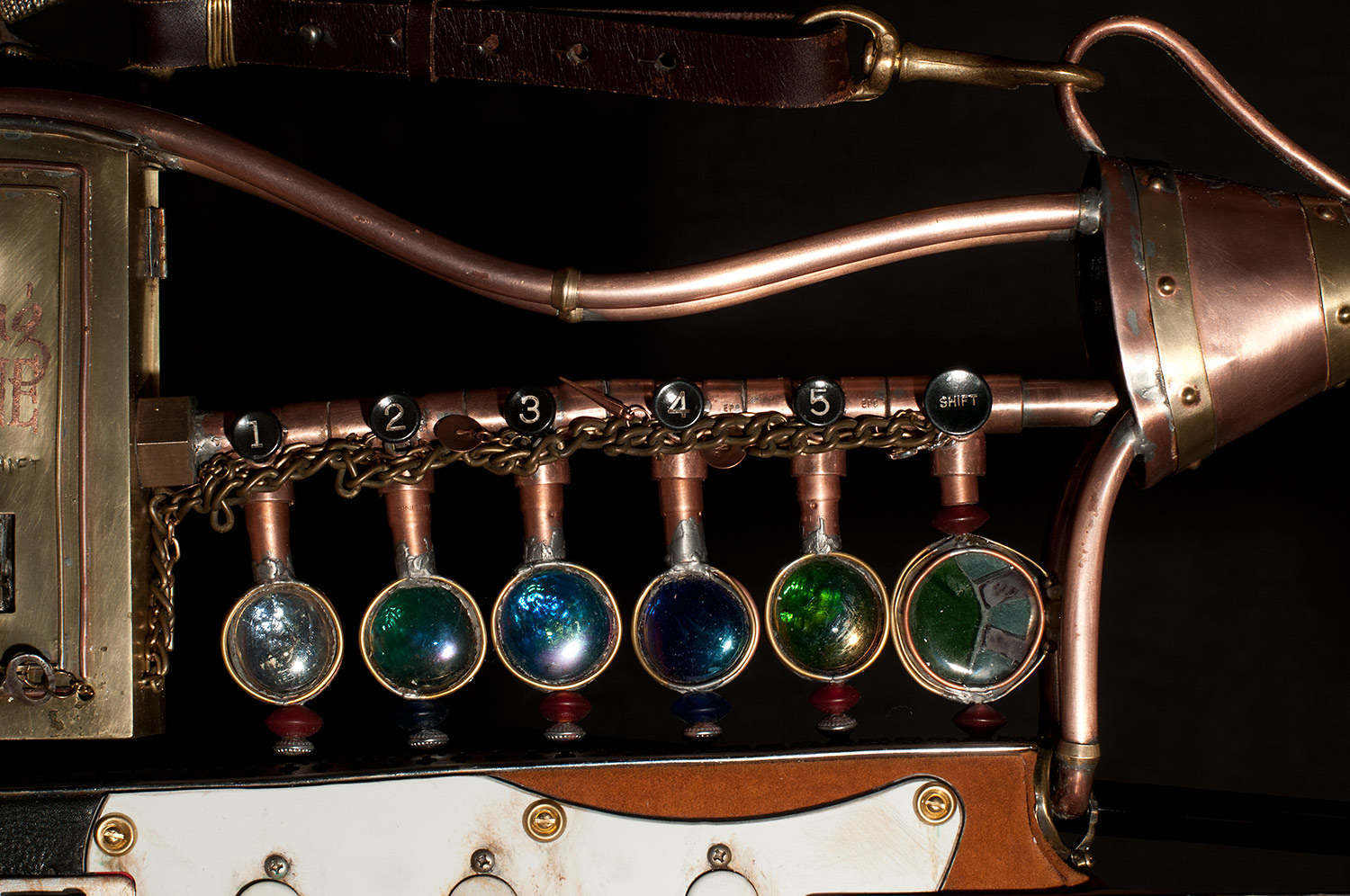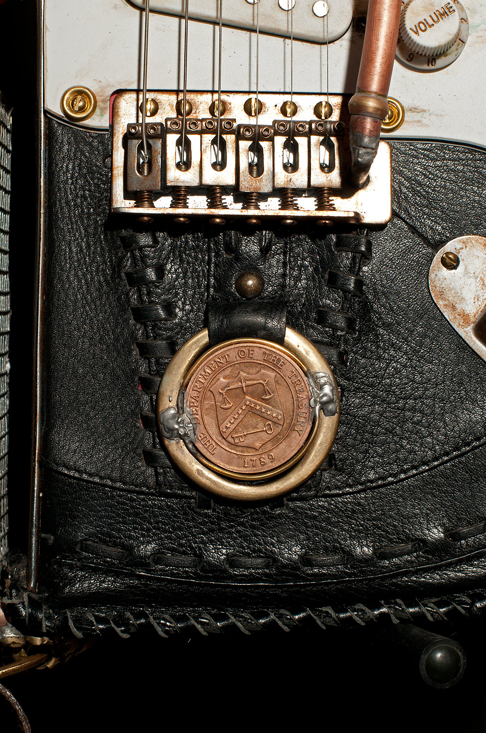From there I started looking around to see what I had to work with and add to the guitar. I used an old pair of suede shorts to cover part of the body. I used an old leather purse to cover the rest. I built a copper and glass structure to use for the time machine meter that was added to the part of the body that was cut way. I built a custom whammy bar from copper pipe. I added a medallion, a sculpted face and other parts that friends donated. There’s just too much to mention, but I had a blast finding parts to re-purpose.