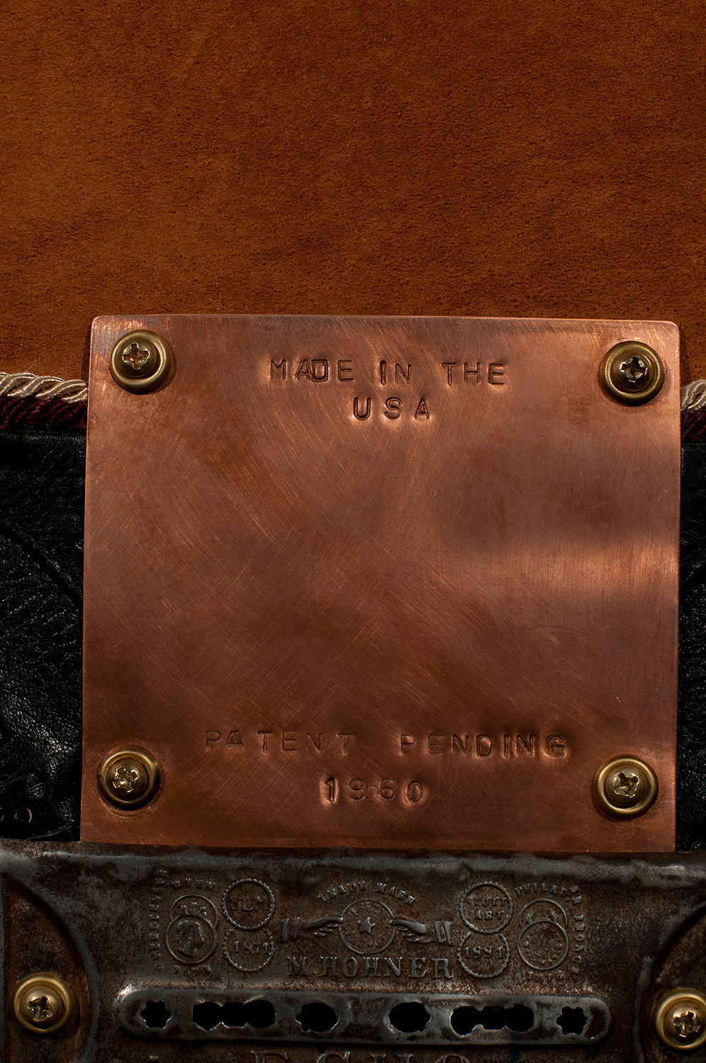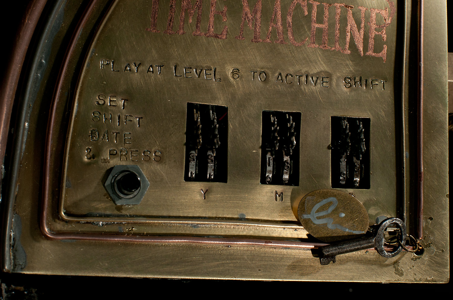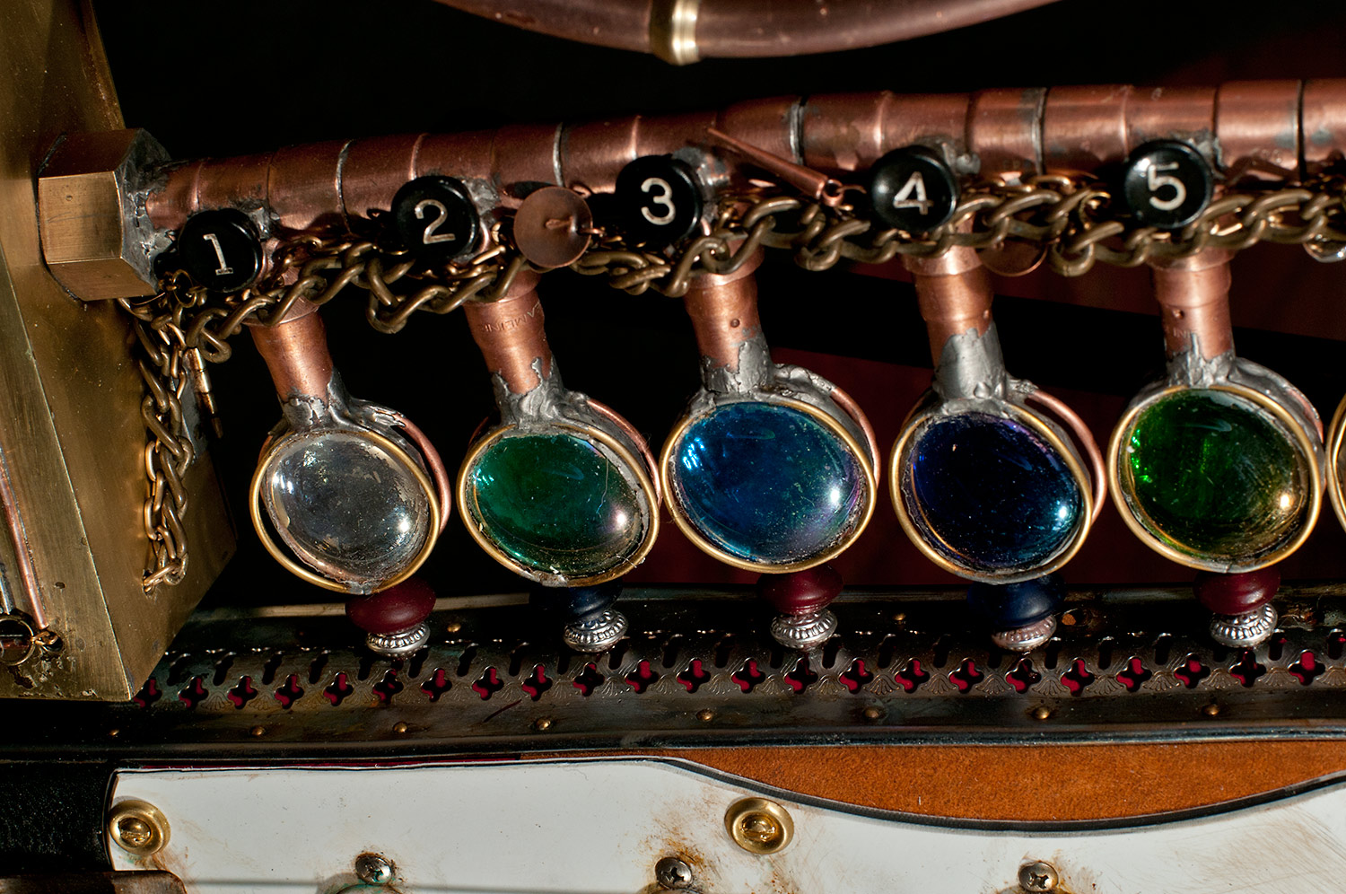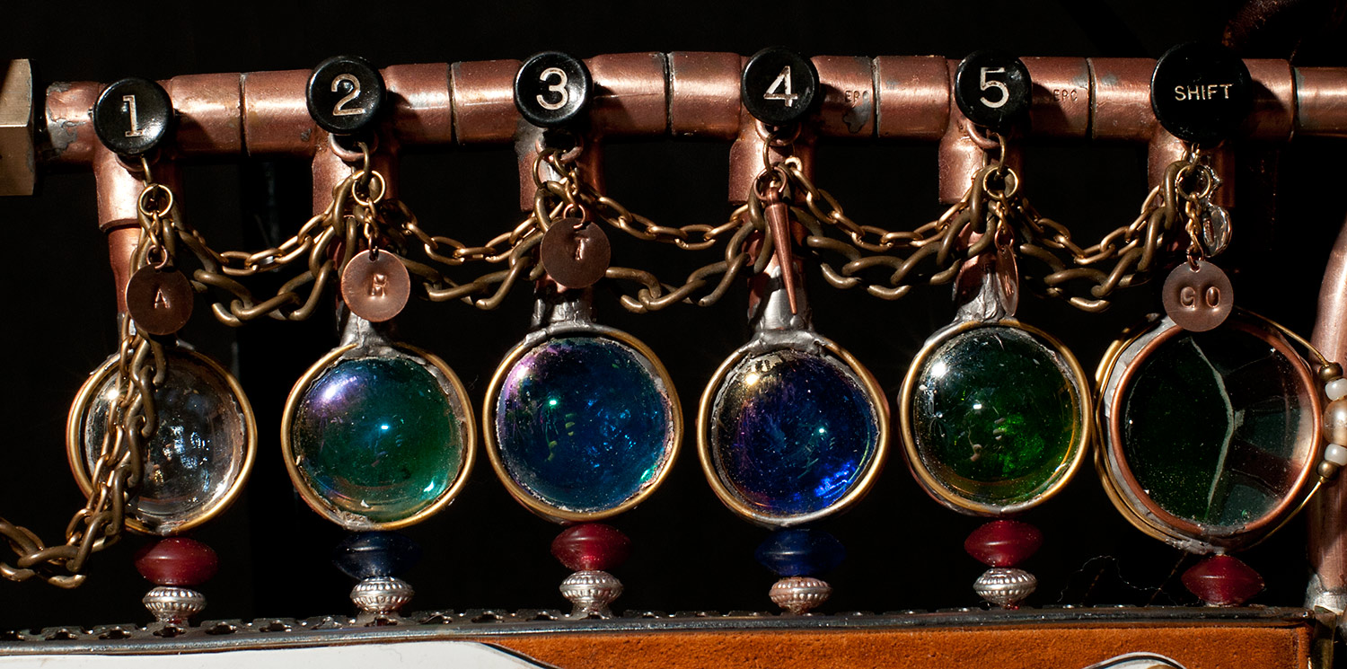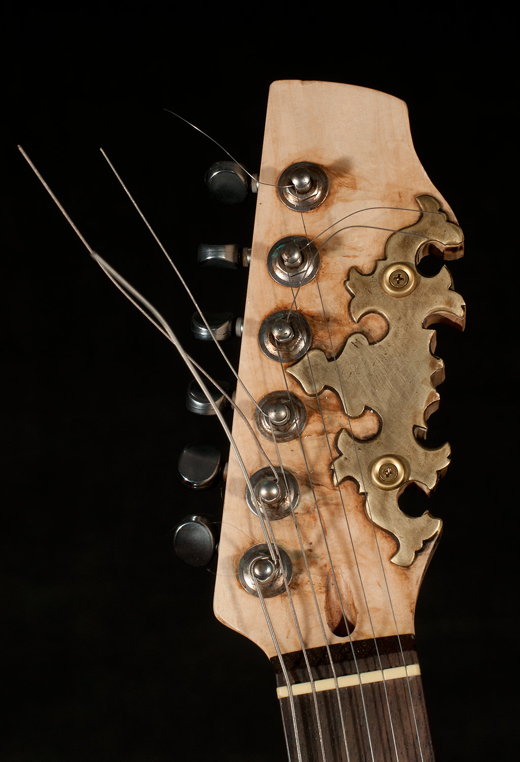 From there I started looking around to see what I had to work with and add to the guitar. I used an old pair of suede shorts to cover part of the body. I used an old leather purse to cover the rest. I built a copper and glass structure to use for the time machine meter that was added to the part of the body that was cut way. I built a custom whammy bar from copper pipe. I added a medallion, a sculpted face and other parts that friends donated. There’s just too much to mention, but I had a blast finding parts to re-purpose.