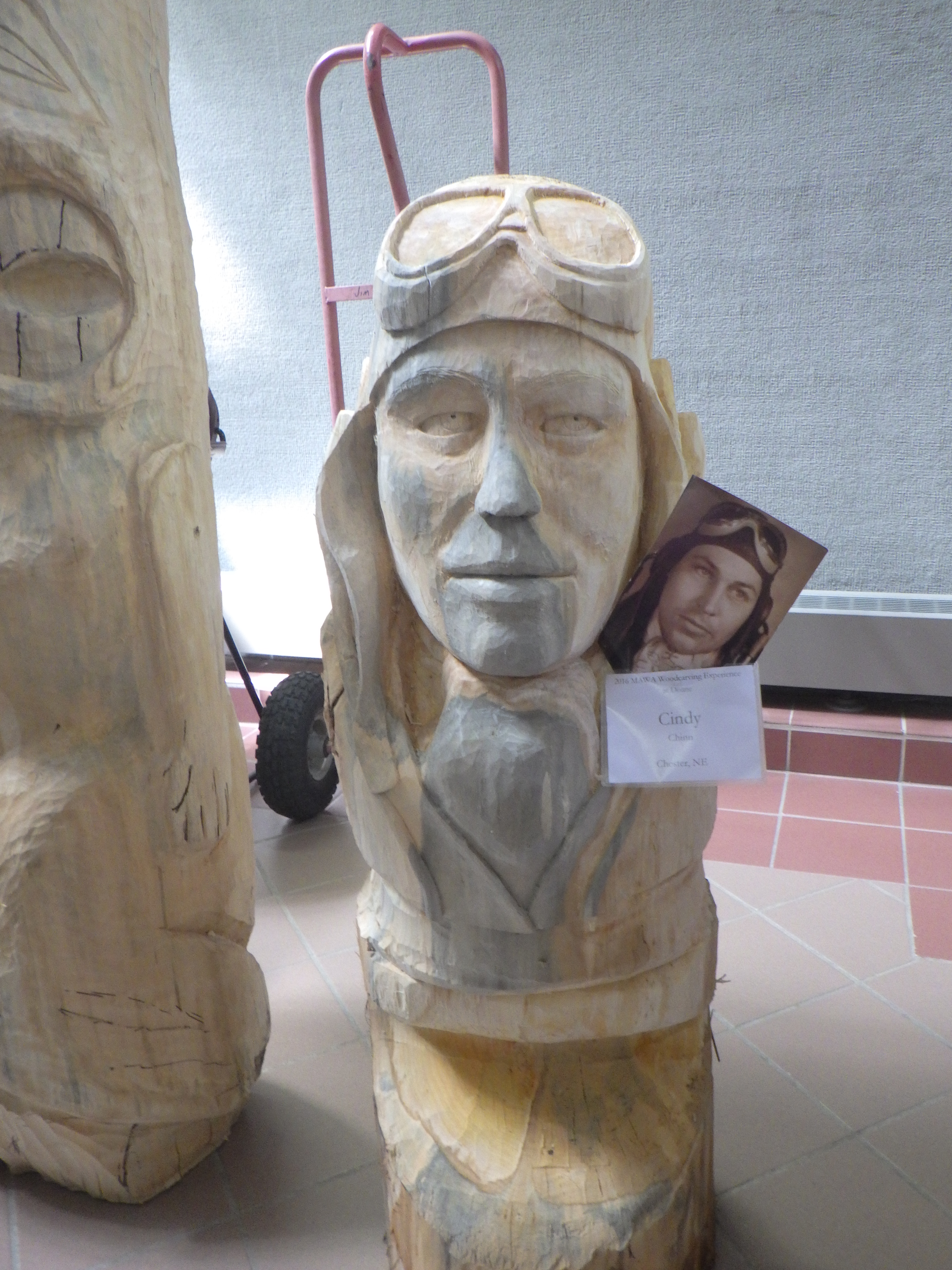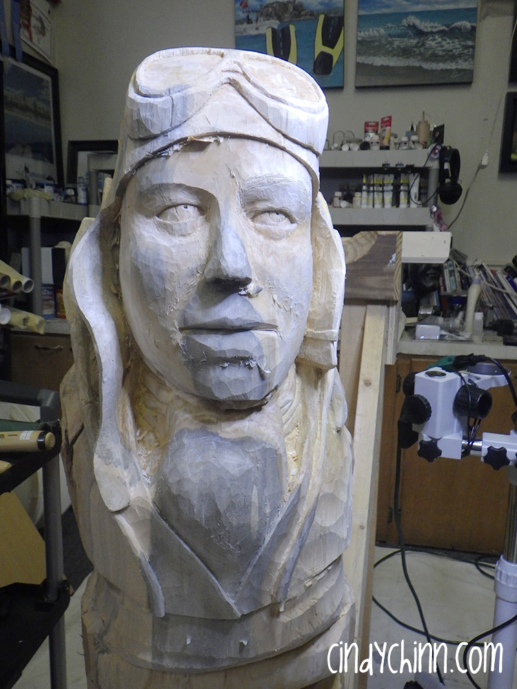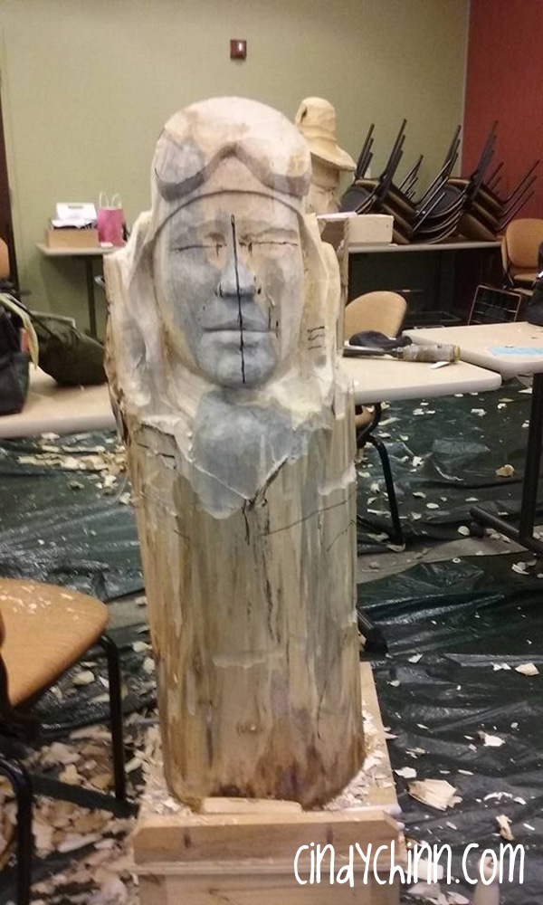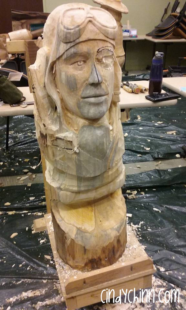 Here are the final images of the custom carved wood portrait. I added a leather strap for the goggles and constructed metal/brass attachments from brass valve stems, bullet casings and plumbing parts, for the headphones. I finished with several coats of Antiquing Oil and “Alton” is ready for me to deliver on his 99th birthday! Which happens to be at the same time as the Doane Experience this year… so I won’t be seeing my new friends.