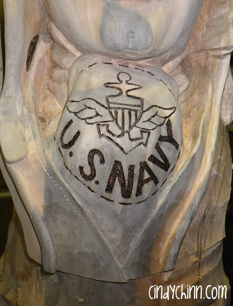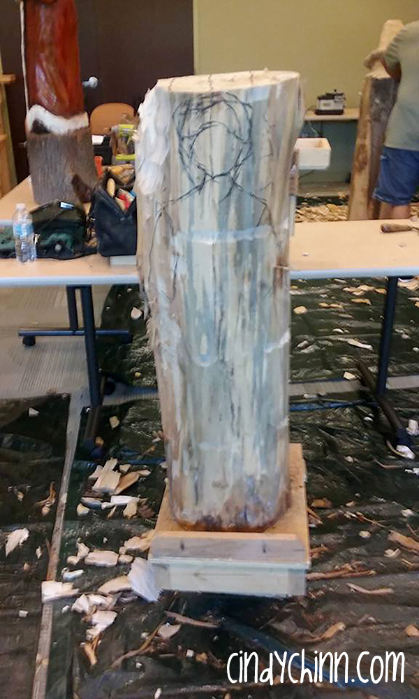 It starts out with a rough sketch on the log to begin the work of taking off the bulk of the wood. You can see in the following photo where I have drawn in the head and shoulders… it wasn’t big enough because Alton is larger than life, therefore his bust should be too! I changed it 10 times before I started actually removing bulk.