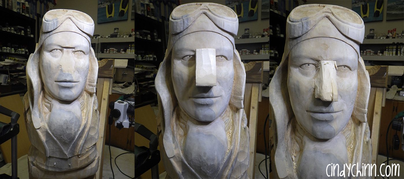 One problem I couldn’t get my mind around was that there was something off with the nose. I had taken off a little too much wood and I would need to fix it before continuing much further. With just a little trepidation (ok a lot), I cut off Alton’s nose and prepared a new piece of wood to replace it.