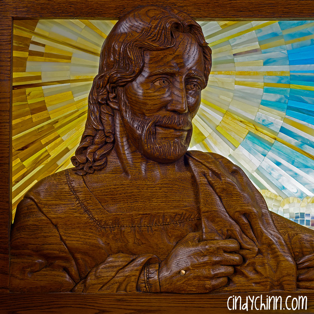 And now I’ve started carving the back of one of the pews. The open area will be filled with a translucent glass mosaic.