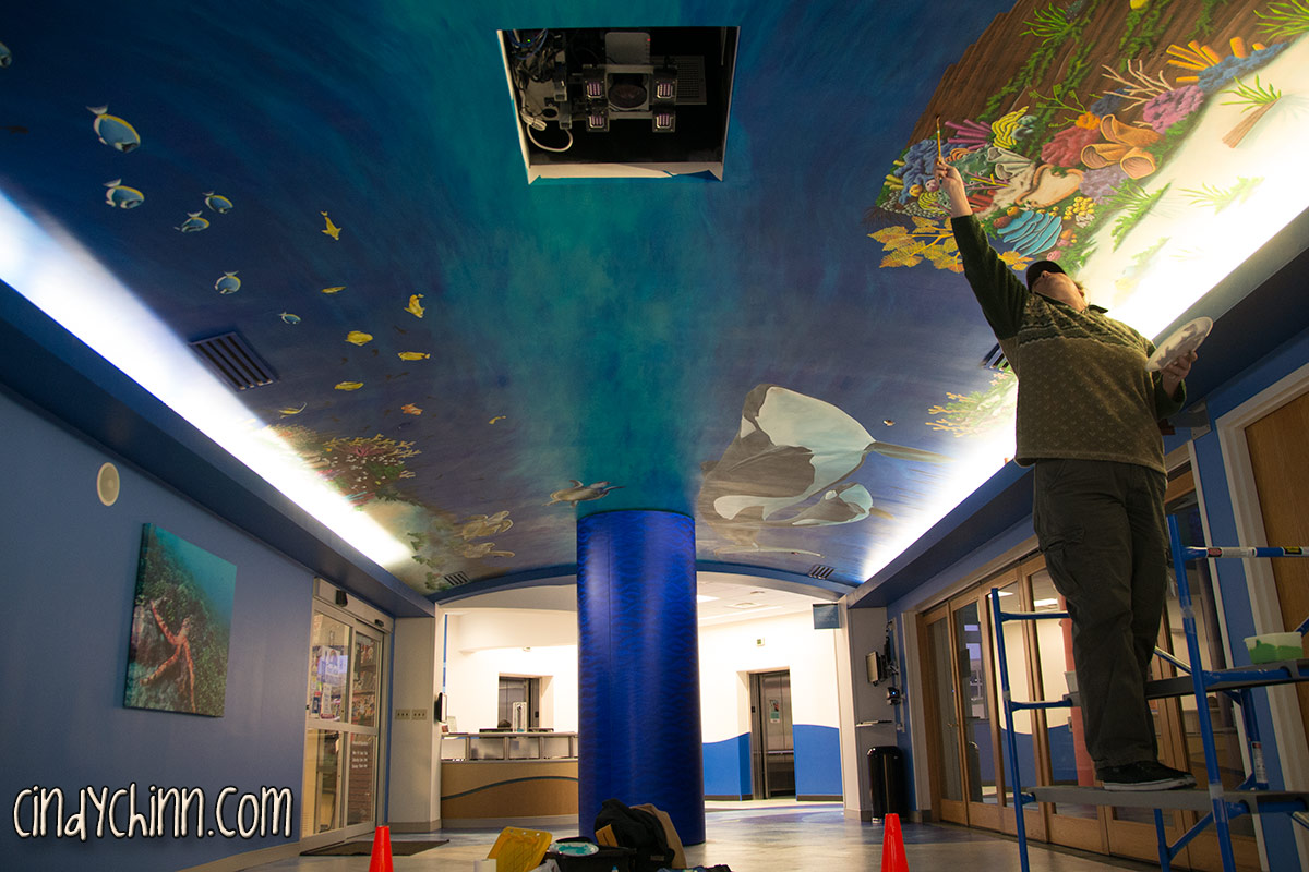 First is my largest project, a 17′ x 50′ (5.2m x 15.2m) ceiling mural, painted in my studio and installed on location in Norfolk, VA. I’ll start with a time lapse video of my work on it, followed by photos.