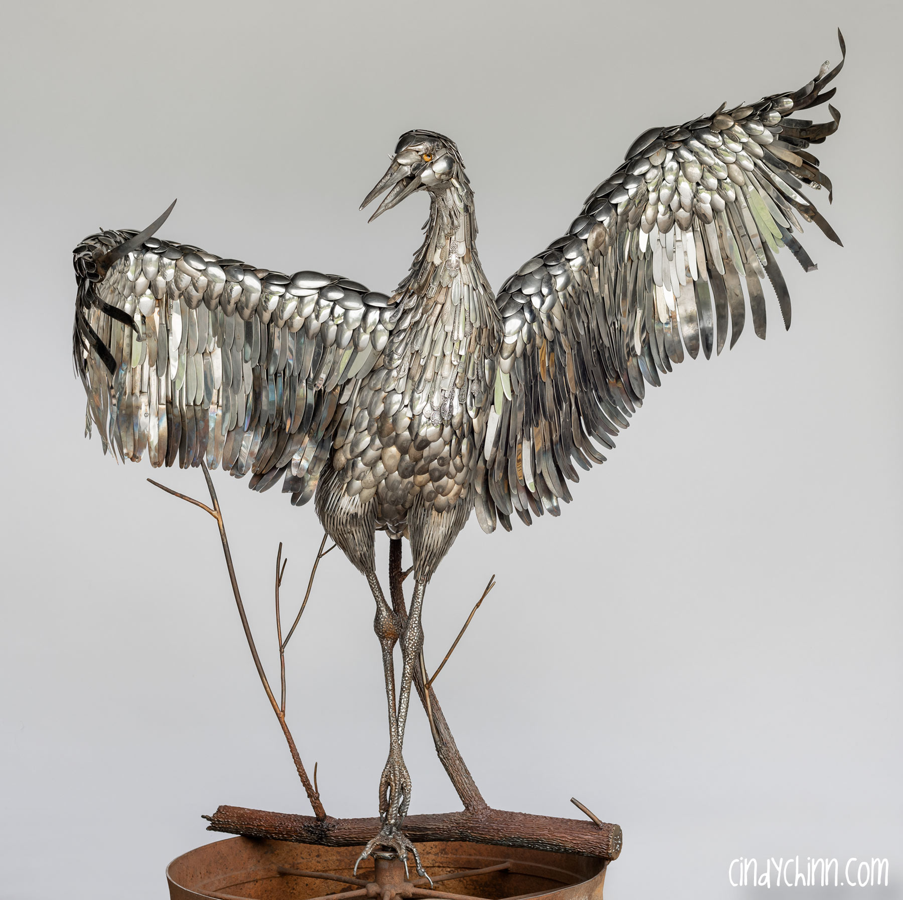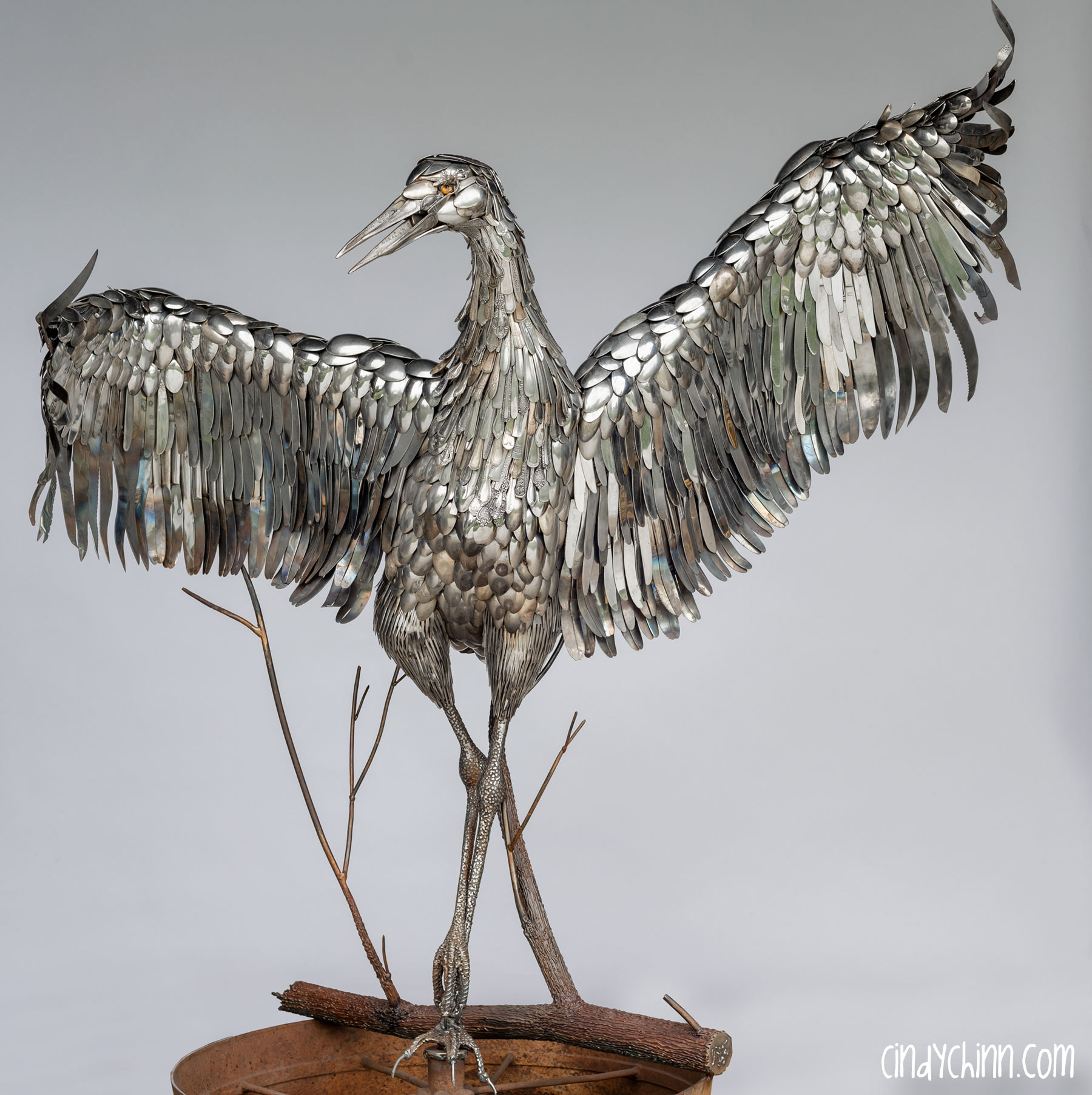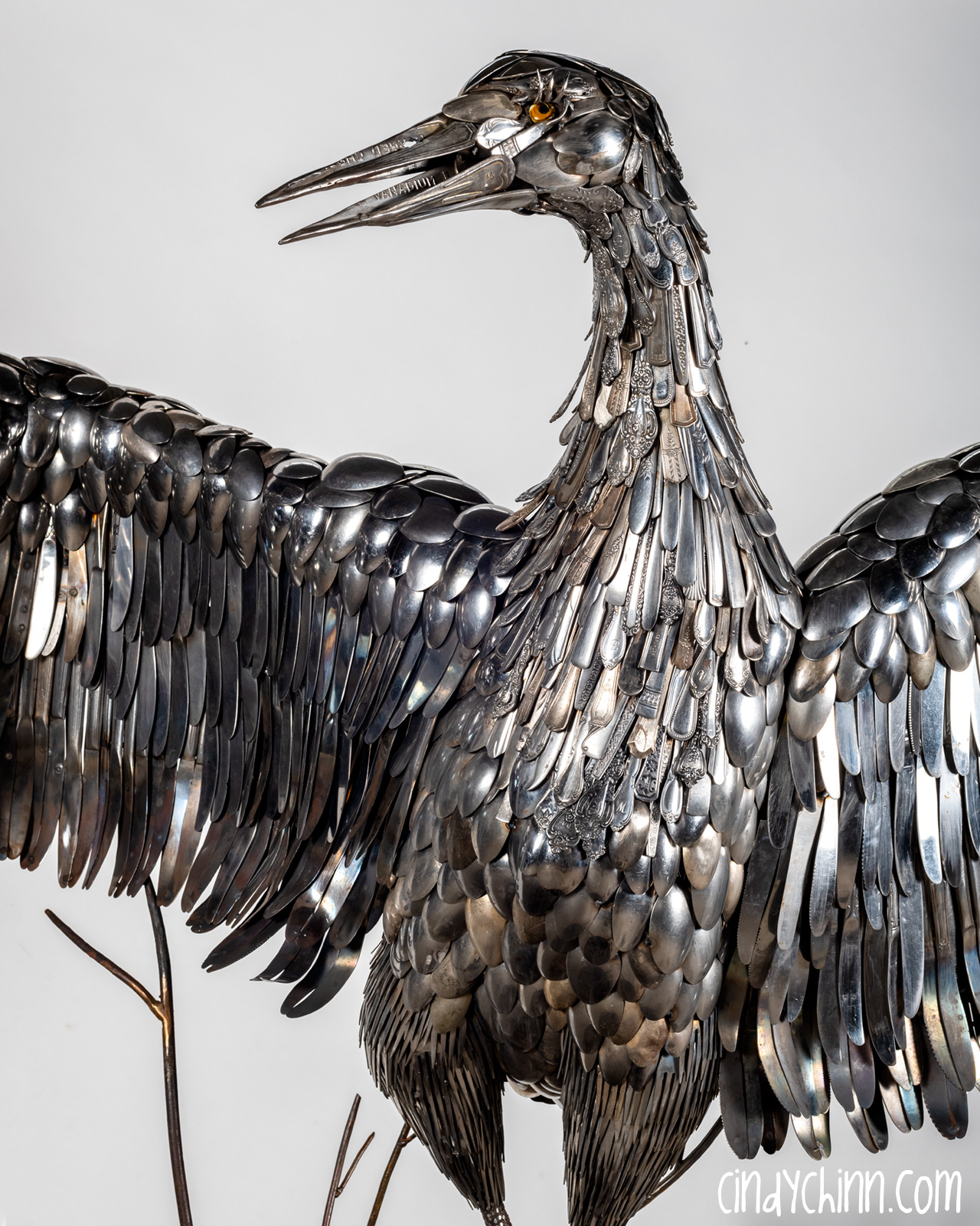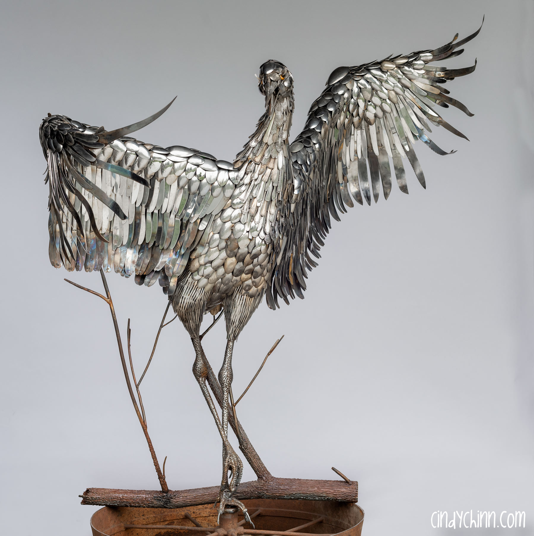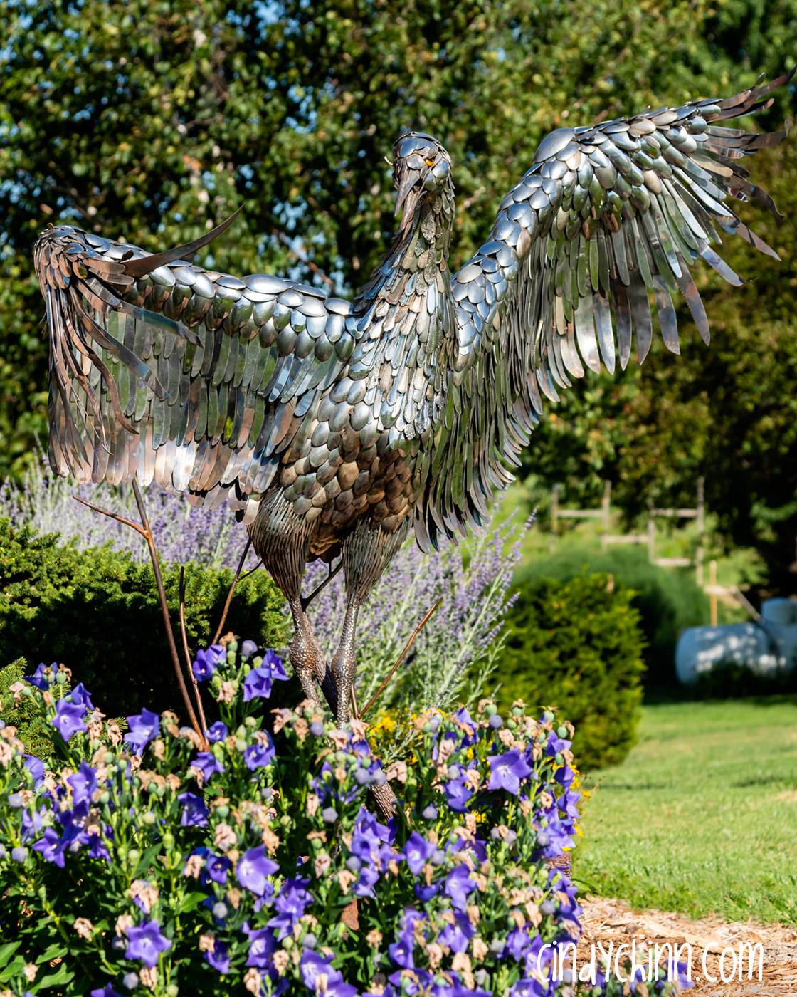 In the summer of 2022, I completed this piece, it’s a life size metal sculpture of a Sandhill Crane made mostly from cutlery. Since moving to Nebraska, I have been fortunate to see the Sandhill Crane migration as endless flocks stop on the Platte river to rest up during their flights north. The Cranes are special part of life in Nebraska, and it was with this thought that a client commissioned this piece for her brother and sister-in-law’s 25th (silver) anniversary. The crane’s name is “Oneida” 🙂
