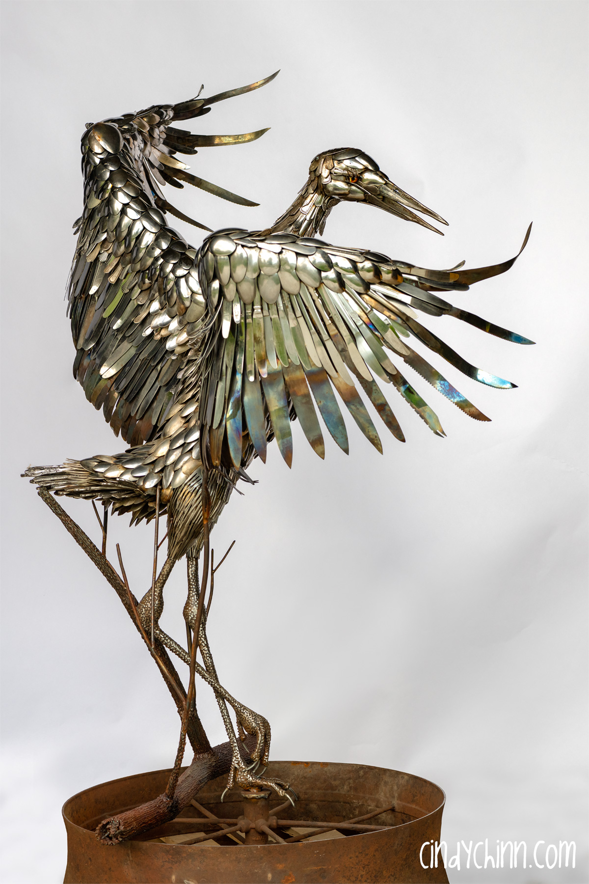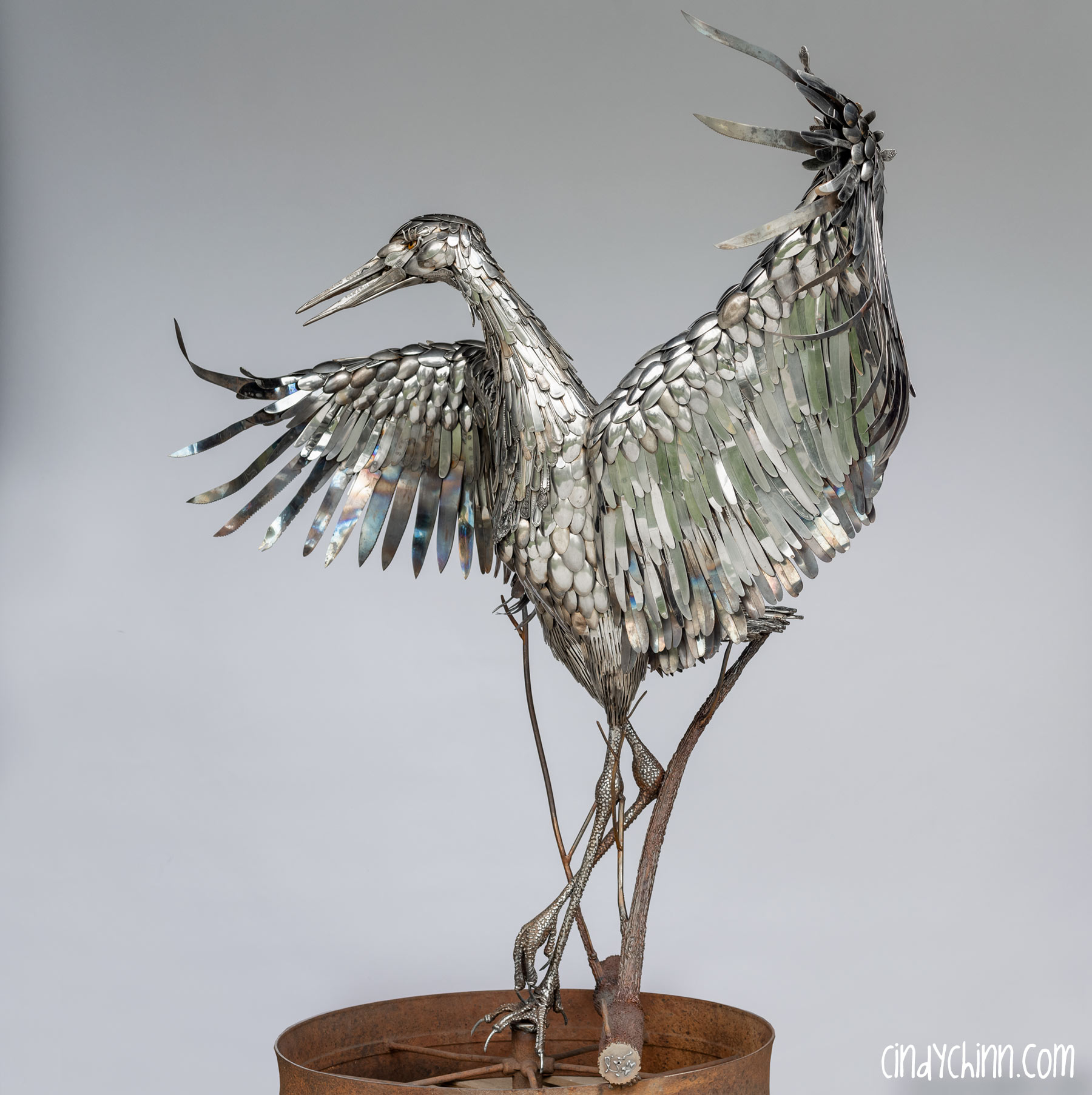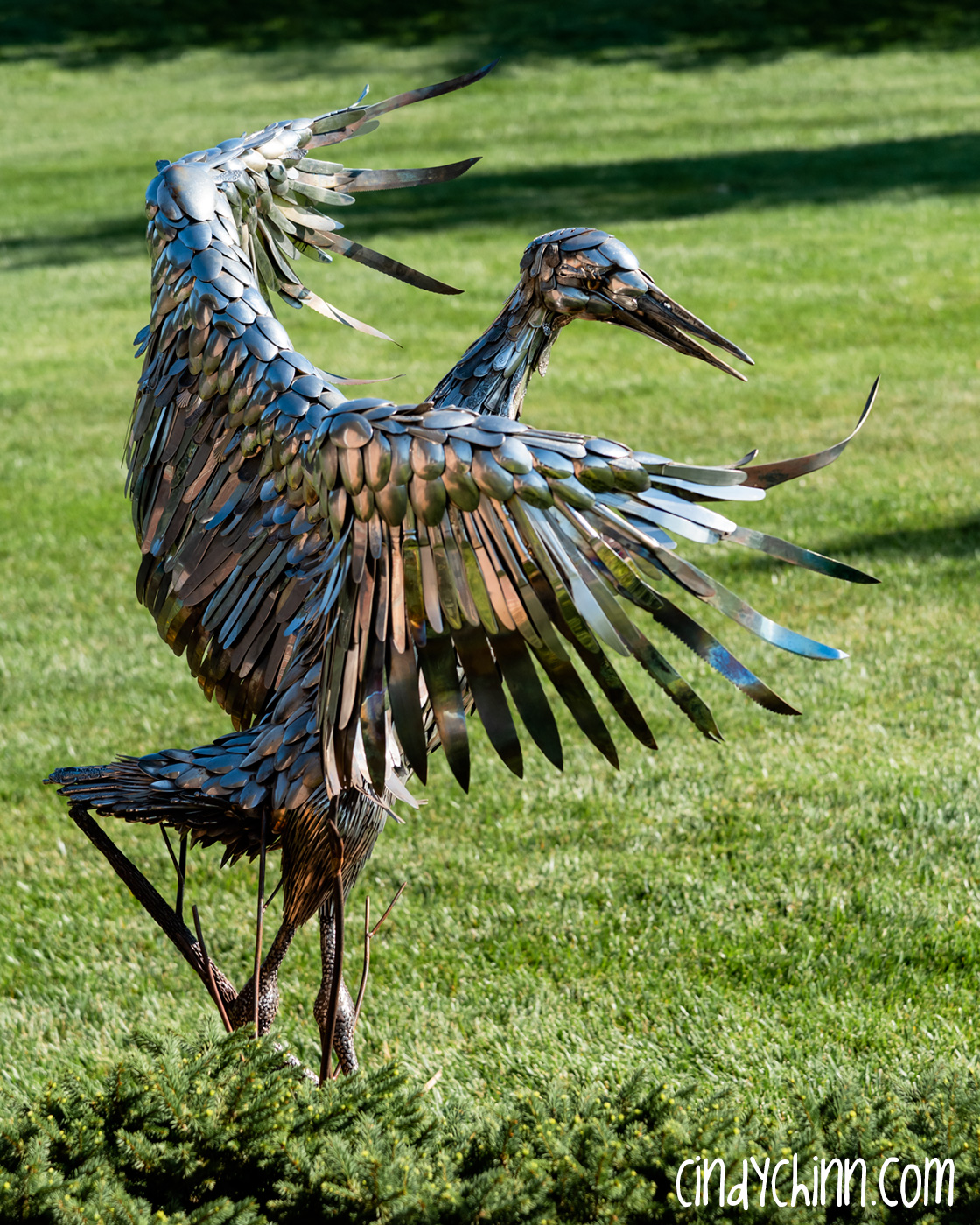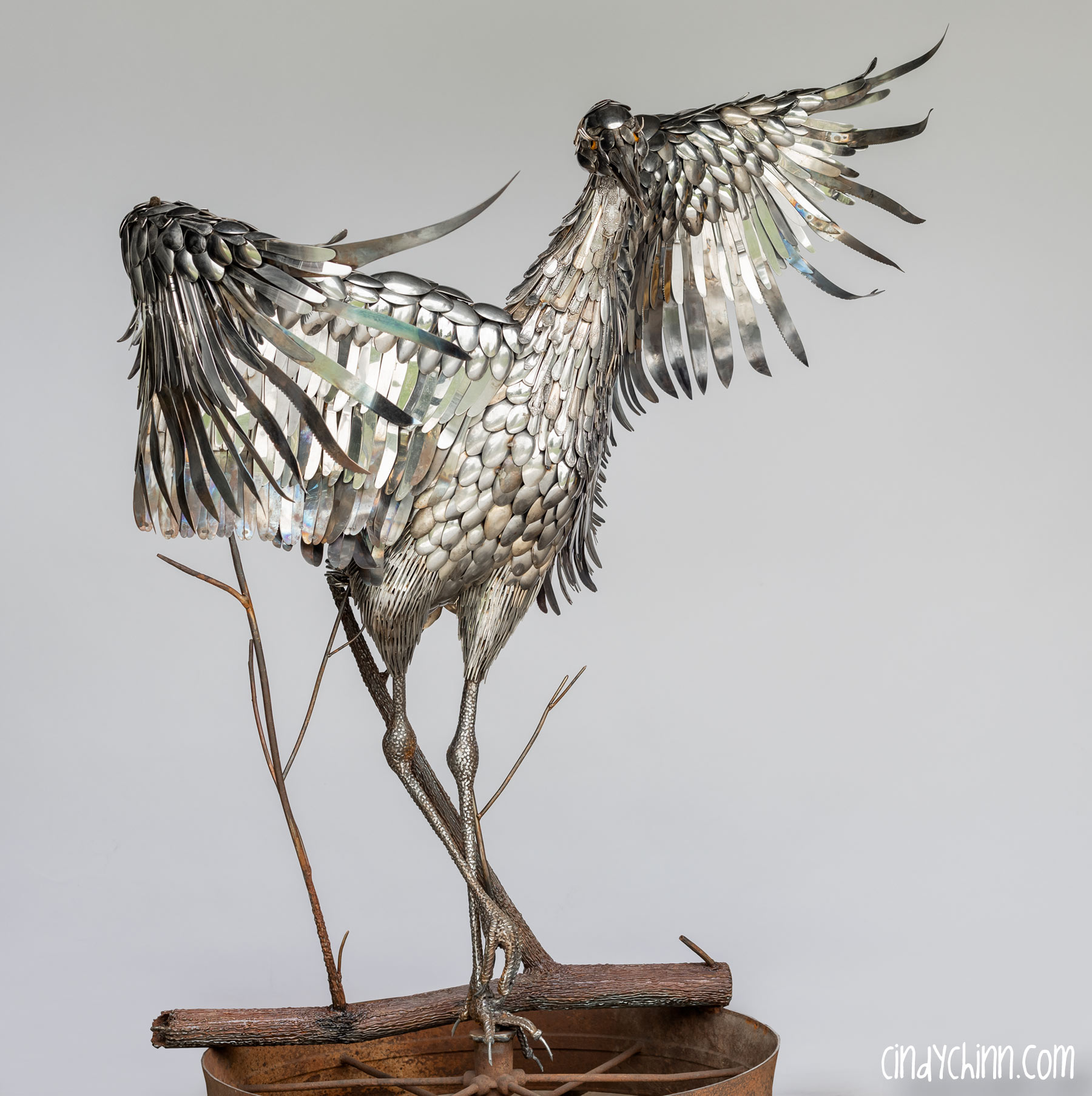 In the summer of 2022, I completed this piece, it’s a life size metal sculpture of a Sandhill Crane made mostly from cutlery. Since moving to Nebraska, I have been fortunate to see the Sandhill Crane migration as endless flocks stop on the Platte river to rest up during their flights north. The Cranes are special part of life in Nebraska, and it was with this thought that a client commissioned this piece for her brother and sister-in-law’s 25th (silver) anniversary. The crane’s name is “Oneida” 🙂