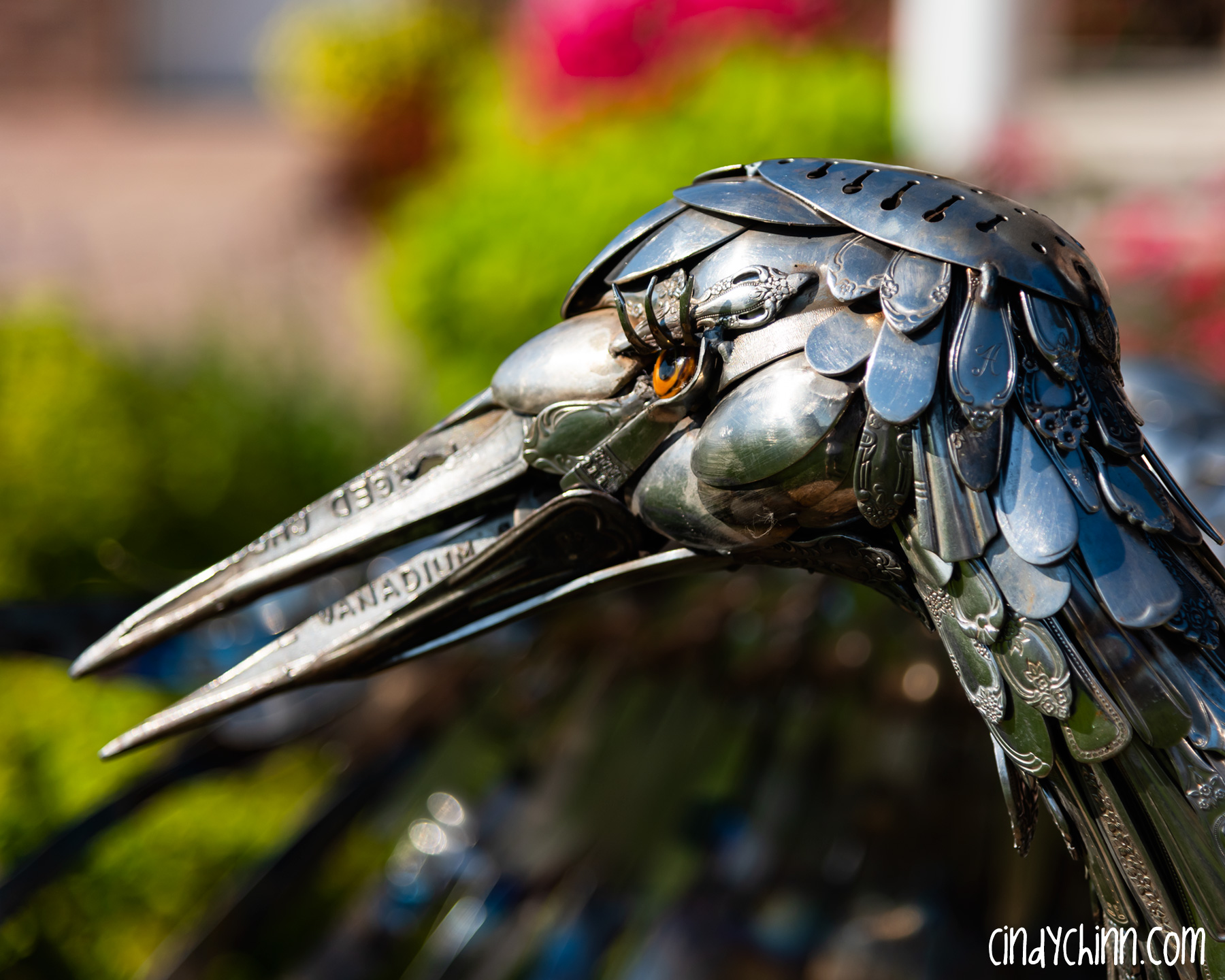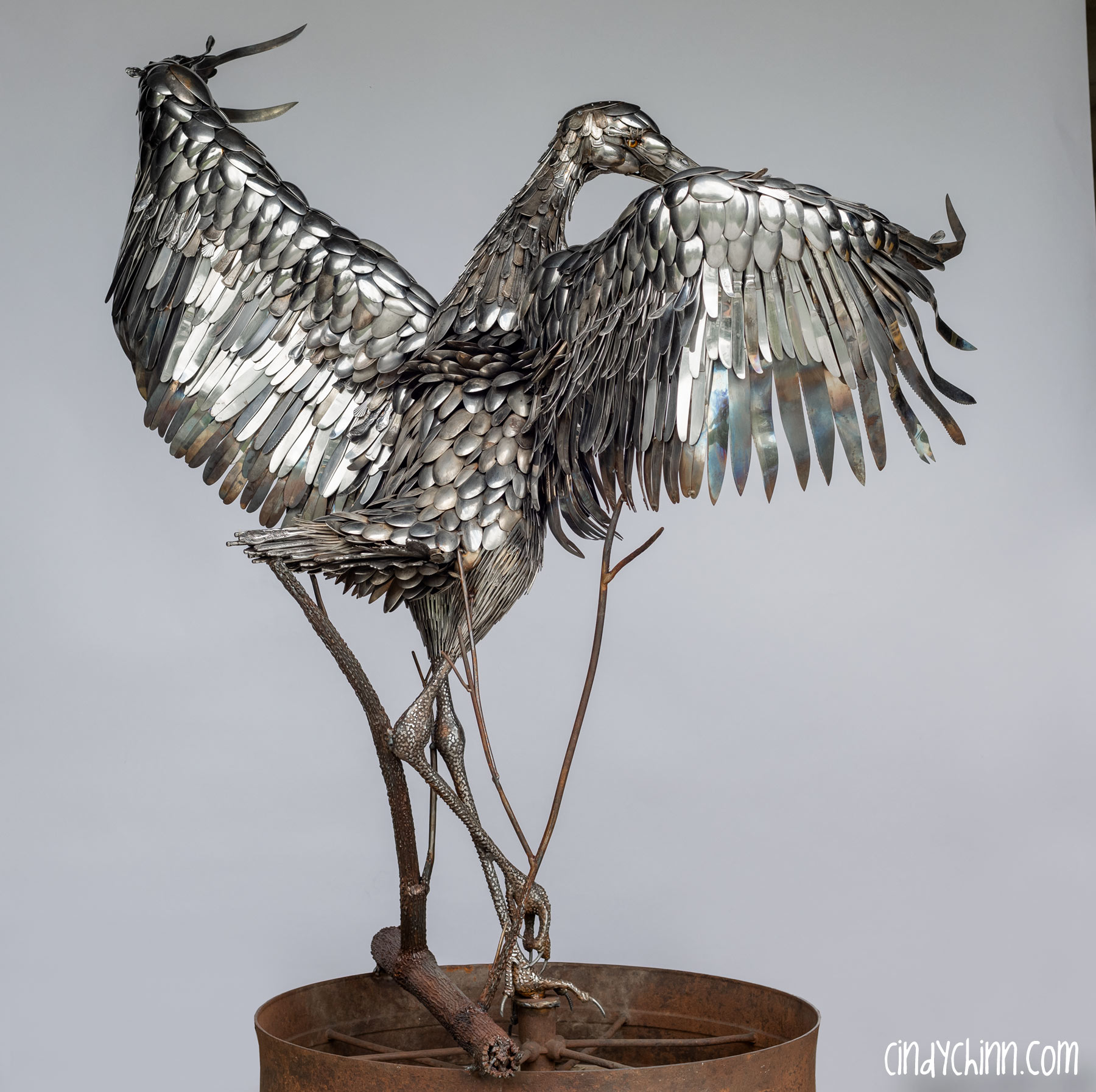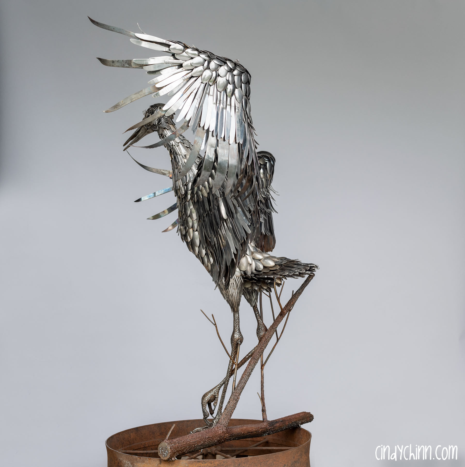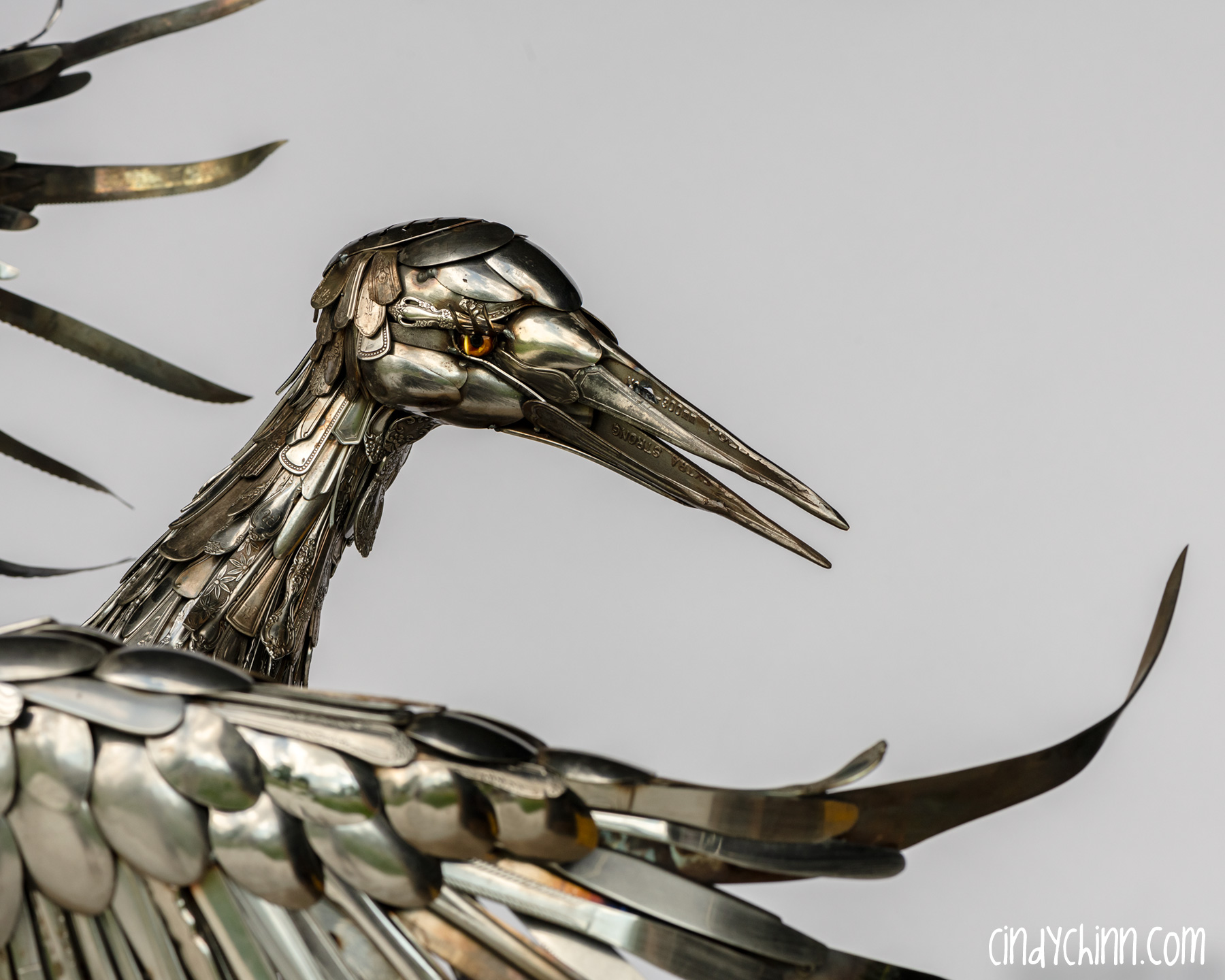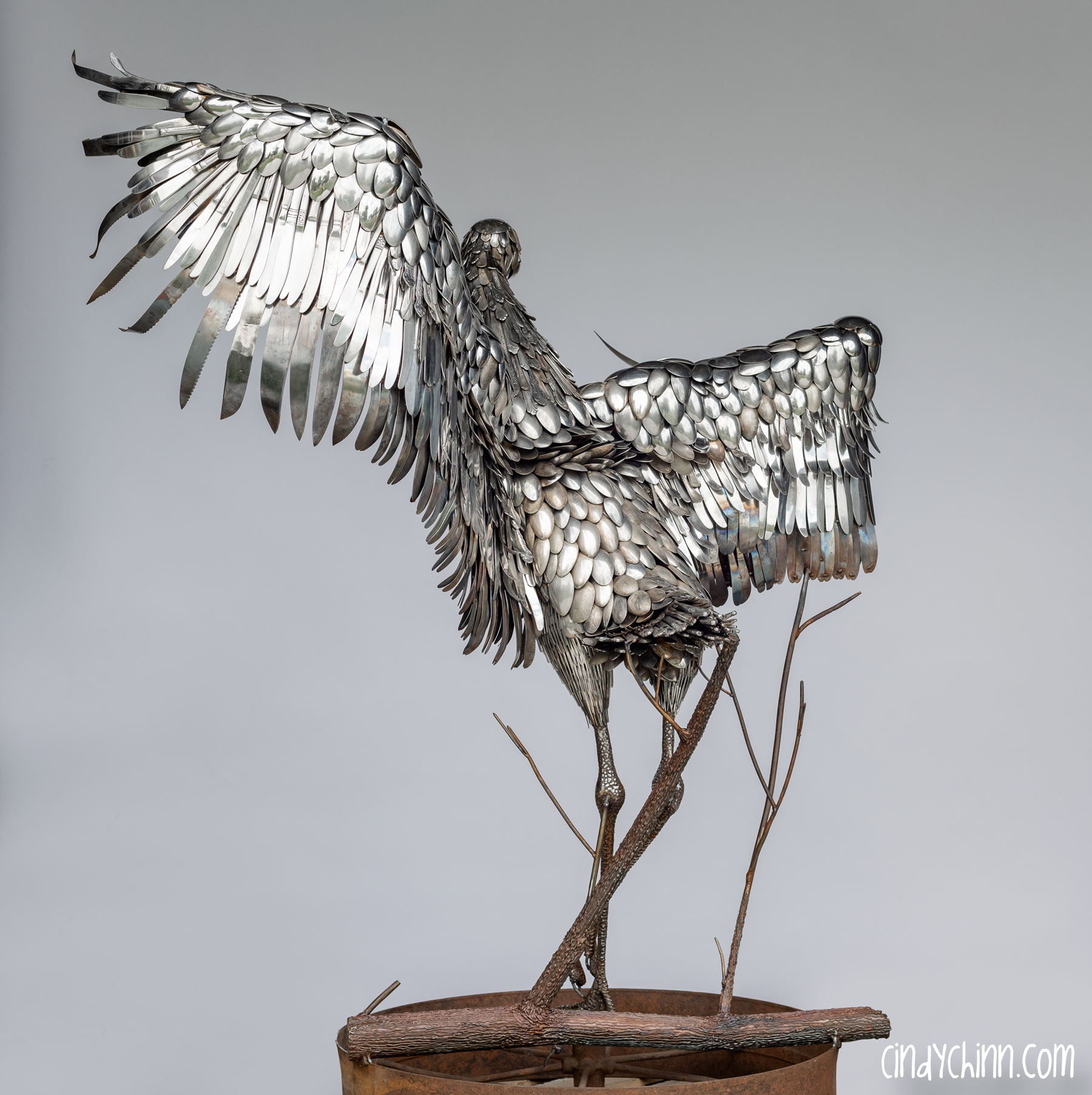 In the summer of 2022, I completed this piece, it’s a life size metal sculpture of a Sandhill Crane made mostly from cutlery. Since moving to Nebraska, I have been fortunate to see the Sandhill Crane migration as endless flocks stop on the Platte river to rest up during their flights north. The Cranes are special part of life in Nebraska, and it was with this thought that a client commissioned this piece for her brother and sister-in-law’s 25th (silver) anniversary. The crane’s name is “Oneida” 🙂
